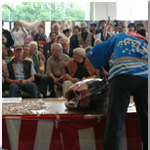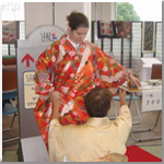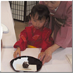 | じょうずにお茶菓子わたせたかな? | マグロの解体は圧巻!皆さん目を丸くして見入っていました。 | きれいな着物にうっとり。 |