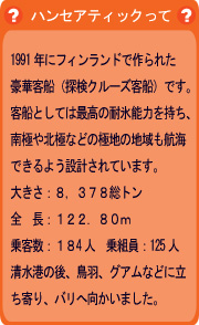 ![]() 平成19年10月1日に、「MSハンセアティック」が入港しました。 清水港では、盛大な歓迎セレモニーが行われ、たくさんの方がお越しくだり、歓迎しました。 |